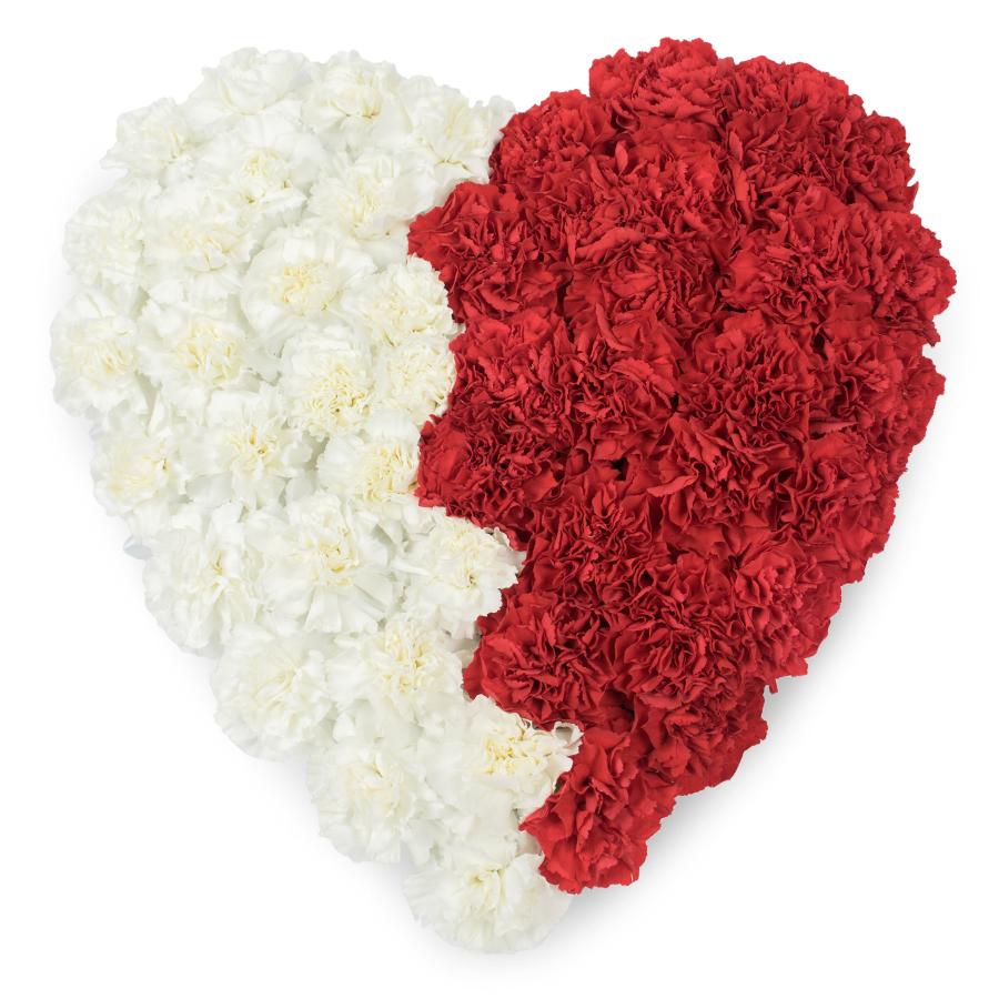 Our Exquisite Heart Arrangement features a beautiful blend of red and white carnations, artistically arranged in a heart shape to symbolize love and sympathy. This unique bouquet is a perfect way to express your heartfelt emotions.